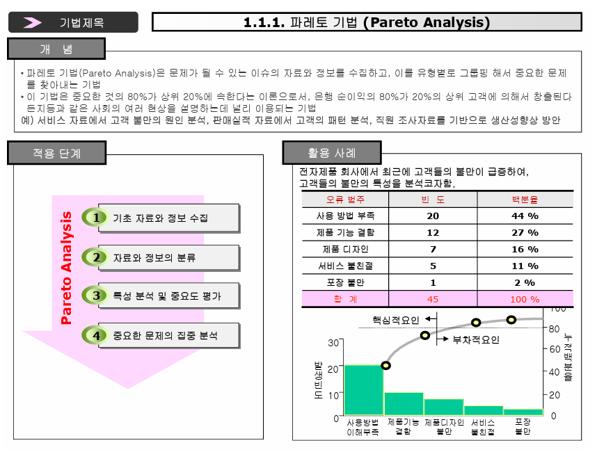 - 과정 분석 (Process Analysis): 문제가 발생한 프로세스나 과정을 분석하여 문제의 근본 원인을 파악하고 개선하는 기술입니다. 주요 도구로는 피셔 다이어그램, 원인-결과 다이어그램, 프로세스 흐름도 등이 사용됩니다.