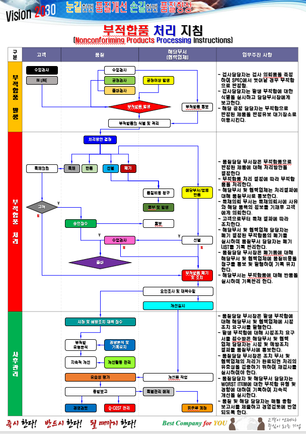 - 부적합 제품의 처리 프로세스(예: 폐기, 공급자에게 반환, 재작업)를 명확하게 정의합니다.