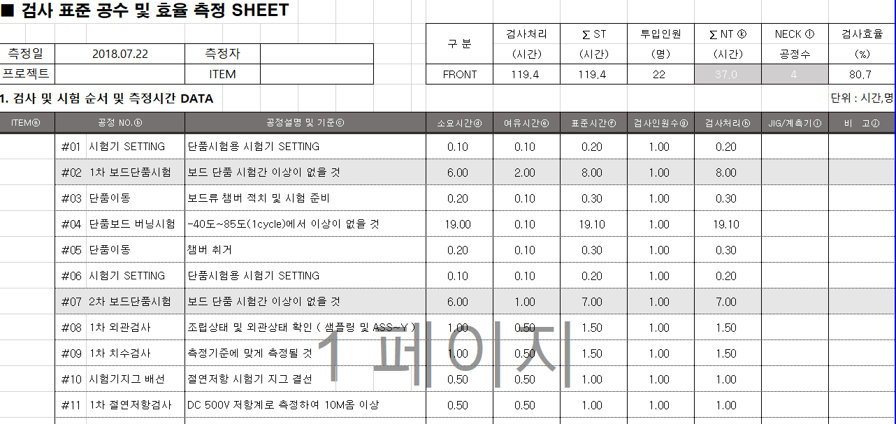 - 검사 과정에서 검사원이 각 작업에 소요한 시간에 대한 데이터를 수집합니다. 이 데이터는 직접적인 관찰, 시간 추적 도구 또는 검사관의 자체 보고를 통해 수집될 수 있습니다.
